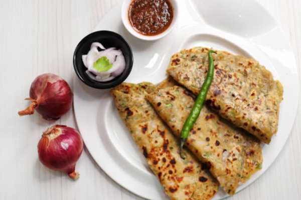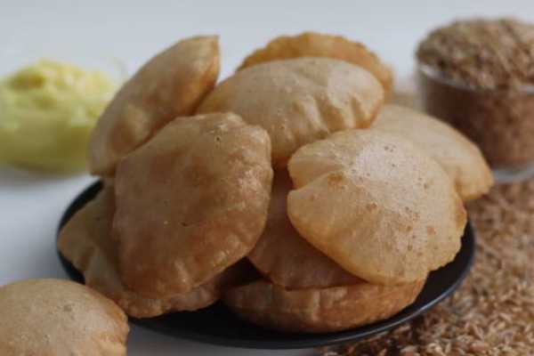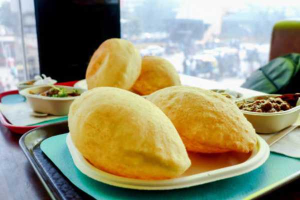 Whole wheat deep fried puffed bread served with Potato and onion curry.