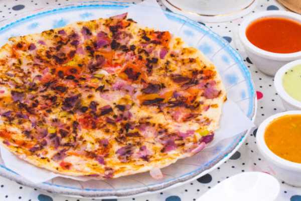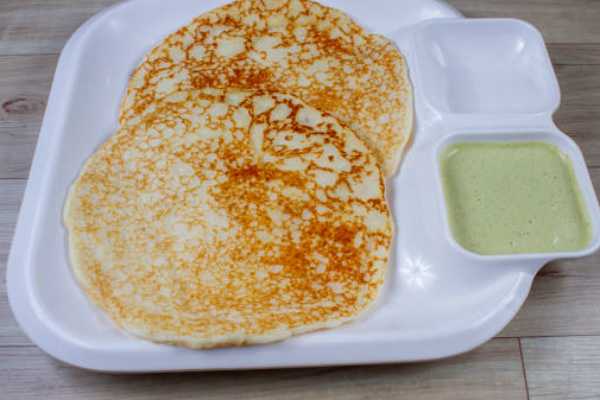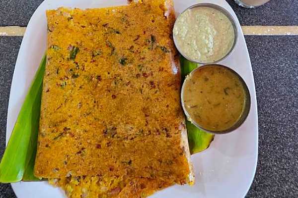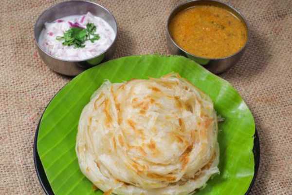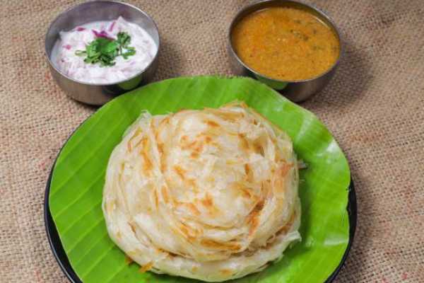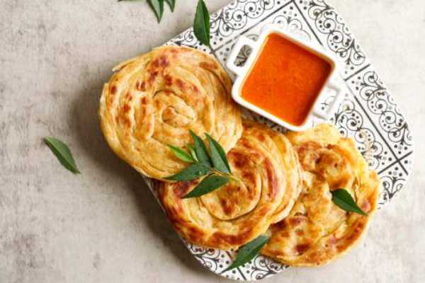 Pan roasted layered bread served with chicken and mixed veg. side.