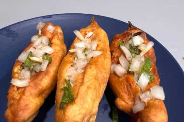 Fried stuffed peppers coated with chickpeas flour, cut and fried