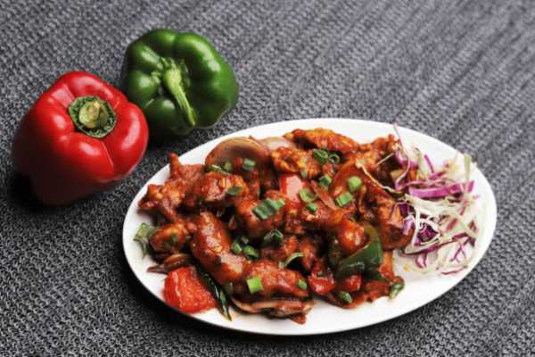 Boneless chicken cooked with bell peppers, onions & Schezwan sauce