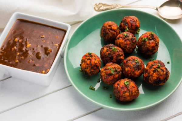 Indian Chinese fusion dish; seasoned & fried house made mixed vegetable balls delicately finished with sweet & spicy sauces, fresh onions & cilantro