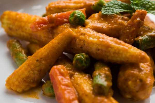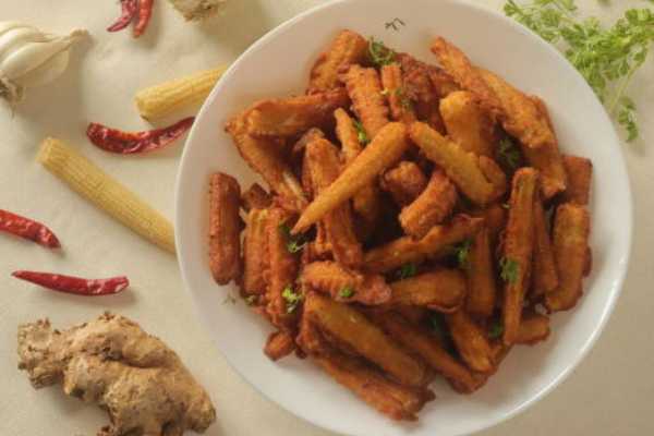 Seasoned, battered & fried baby corn smothered in a special sauce made from naturally aromatic Curry Leaves (Karivepaaku)