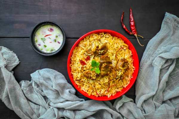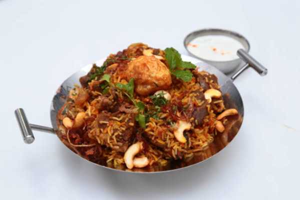 A ve A versatile Hyderabadi offering of meat marinated in Herbs and Spices is layered with long Grain basmati rice and steamed to perfection in a tightly sealed heavy bottomed dish. All biryani's dishes are served with Raitha(Yogurt Dip) and Mirchi salan alongside as the ideal accompaniment to this house special dish.