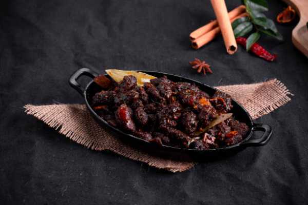 Boneless chicken fried and tossed with onions, chillies curry leaves and spices
