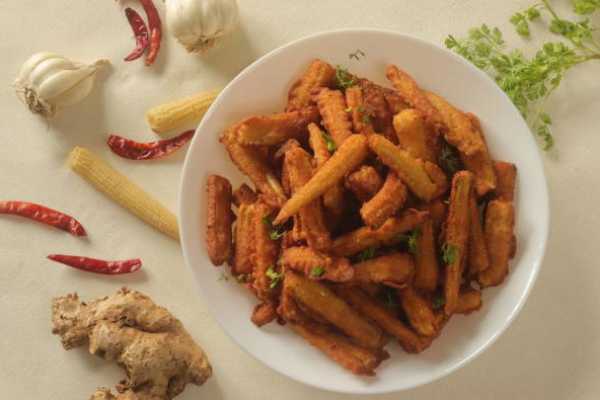 lightly battered baby corn deep fried and sauteed with sweet and hot sauce